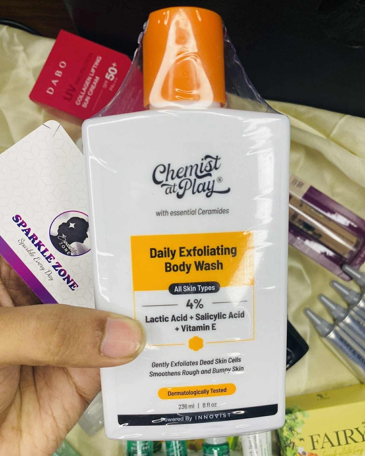 The Chemist At Play Exfoliating Body Wash is a gentle yet effective solution for dull, rough, or bumpy skin. Powered with 1% Salicylic Acid, 2% Lactic Acid, Ceramides, Vitamin E and Murumuru Butter, this body wash for women & men exfoliates dead skin, unclogs pores, fades tan and leaves your skin soft and hydrated. Whether you're dealing with strawberry legs, body acne, or sun-induced dullness, this tan removal body wash offers visible results with every wash.